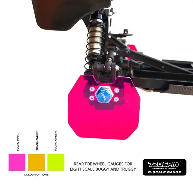 720SPIN Camber Gauge Rear Wheels intended for use with all 1/8th off road buggies with 17mm hex drive will compliment the front 720SPIN Toe and Camber Gauges.