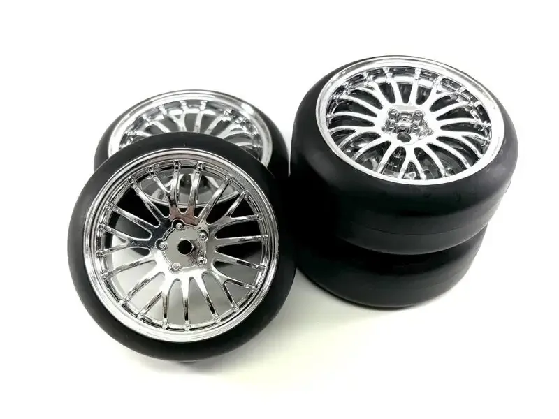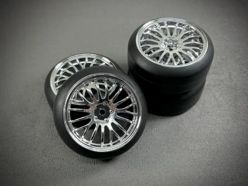 This drift wheel set allows you to transform your touring car into a drift vehicle. The special style makes your RC car a real eye-catcher and the very sloping tire sidewall allows you to lower the vehicle really deep into the wheel arches.