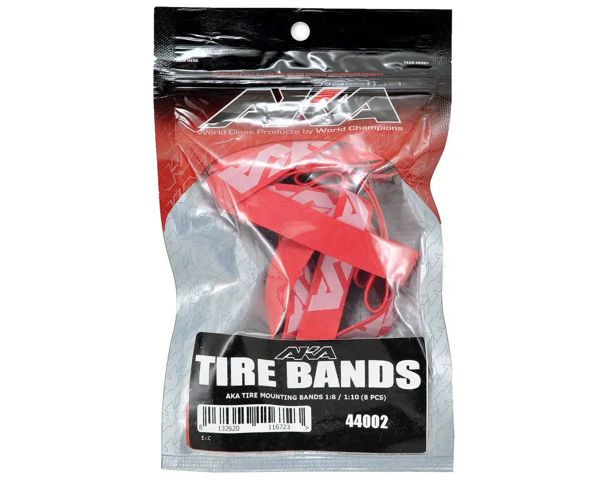 This is a pack of eight AKA Racing Tire Glue Bands. These bands are suitable for mounting up all 1/10 scale and 1/8 scale off-road tires. Made in the USA.