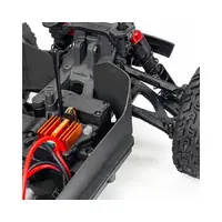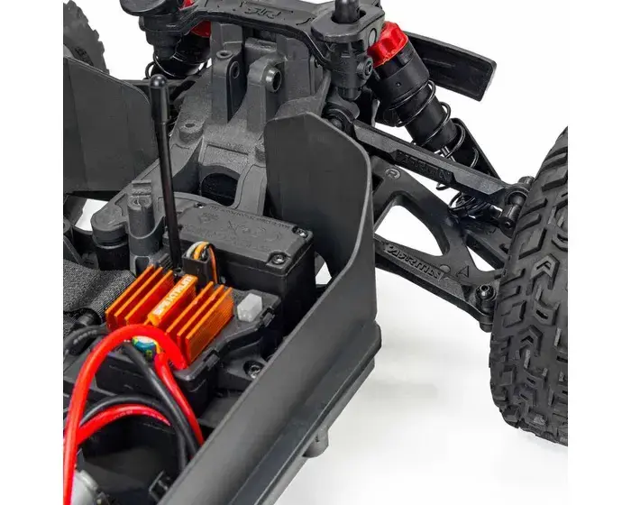 The self-bleeding, oil-filled shocks with silicone O-rings use a tried and tested, coil-over design for effortless maintenance and amazing handling. The spring perches feature integrated dirt guards to keep the shocks running smooth. High chassis guards limit the amount of dirt and debris that can get into the chassis tub. Shock-absorbing loops keep the front and rear bumpers secured to the chassis, offering defense against heavy impacts. An injection molded rear wing and body protection roof skids are also included.