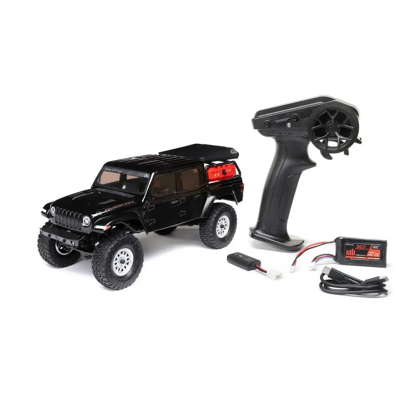 Inside the box, in addition to the assembled and finished rig, you’ll find a Spektrum 2.4GHz transmitter, 350mAh LiPo battery, and handy USB charger. Four AA batteries are even included for the transmitter. Take your own overland adventure, RC-style, with the Axial SCX24 Jeep JT Gladiator — a rig you know is ready for anything!
