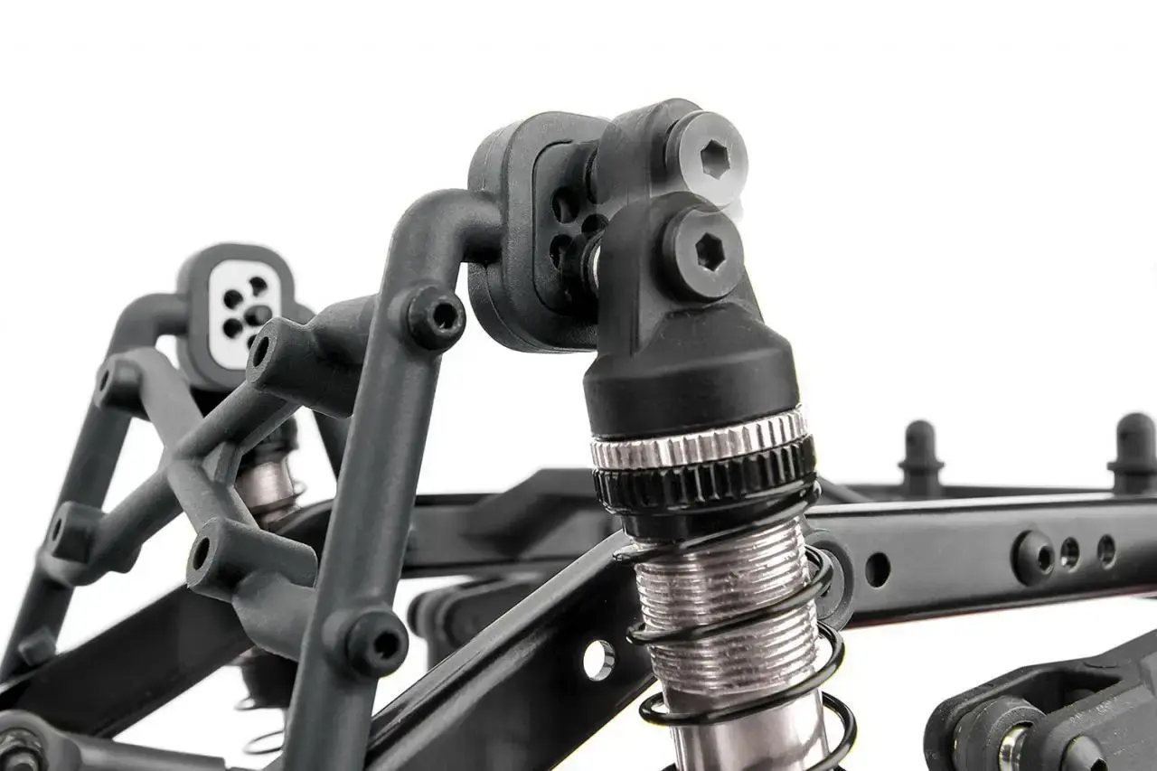 What makes the Enduro Ecto Trail Truck special? The Gatekeeper Suspension package (GKSTM)! The GKS package consists of rear trailing arms that move the shocks forward, allowing a larger window for shock tuning and providing improved weight bias. The trailing arms are paired with a rear anti-roll bar for a more stable and consistent suspension when crawling on the rocks. An adjustable aluminum track bar mount firmly bolted to the chassis rail gives the Enduro Ecto more reliable and responsive steering without the flex. Our shock mount inserts with multiple mounting positions allow for precise suspension tuning, whether they're moving the shocks up, down, forward, or back.