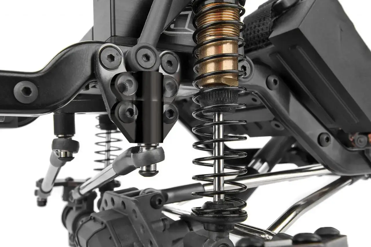 We’ve updated the Builder’s Kit yet again by including our GKS™ shock towers in front and rear. Our shock mount inserts provide the ability to adjust shock angle, droop, and vehicle ride height without affecting spring preload. Matched up with the shock mount inserts are our race-proven ultra-smooth Factory Team bronze shocks with black plastic bleeder caps and collars–perfect for traversing rough terrain. Along with the updated shock towers, we’ve included the GKS aluminum track bar mount that is bolted directly to the frame rails. This makes the front suspension more rigid and flex-free with a more precise steering feel. Also included are updated Factory Team 12.3 and 12.8-inch wheelbase high-clearance links with black nitrate finish and durable Factory Team steel pivot balls for smooth articulation.
