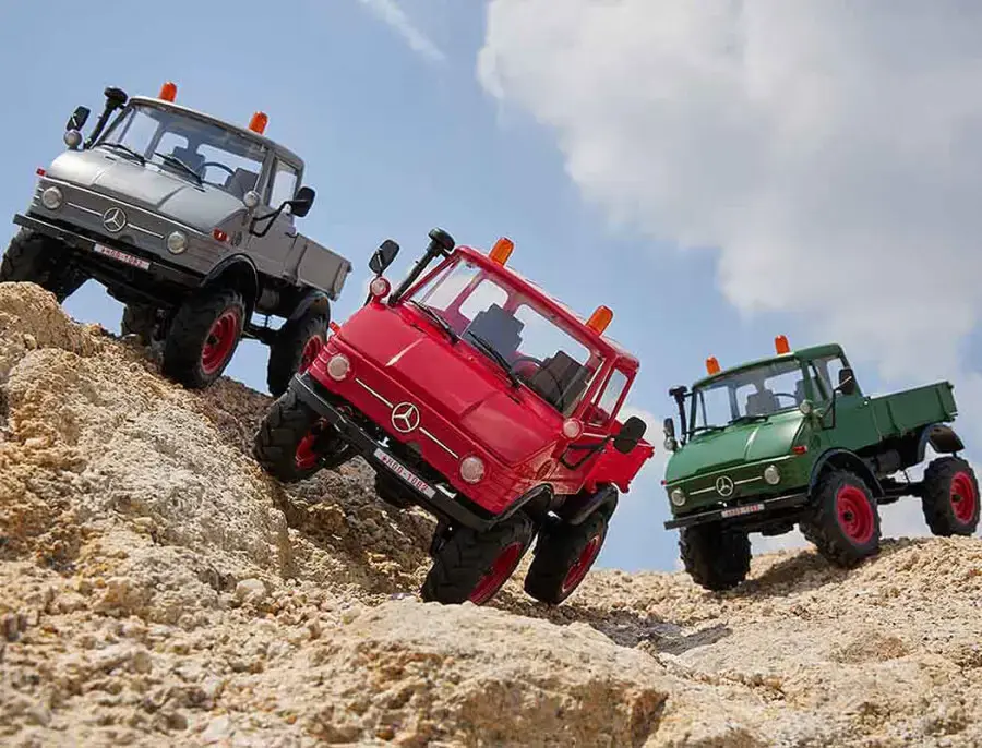 Unimog adopts the FCX24 crawler chassis. The mid-mounted power assembly has a low center of gravity and integrates the 2-speed transmission, transfer case and 130 motor. Power is transmitted to the front and rear axles through the universal joint drive shaft and axles are equipped portal axles which increase the ground clearance of the centre axle.