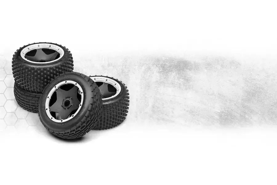 Specially constructed high-impact nylon 3-piece bead lock wheels are included, featuring NEW inset heavy-duty metal hex hub inserts for massively increased wheel durability. The contrasting beadlock ring is bolted onto the wheel with 20 screws to securely hold the tire in place. No glue is used to mount the tires, which makes changing the tires quick and easy and the wheels can be used again with brand new tires.