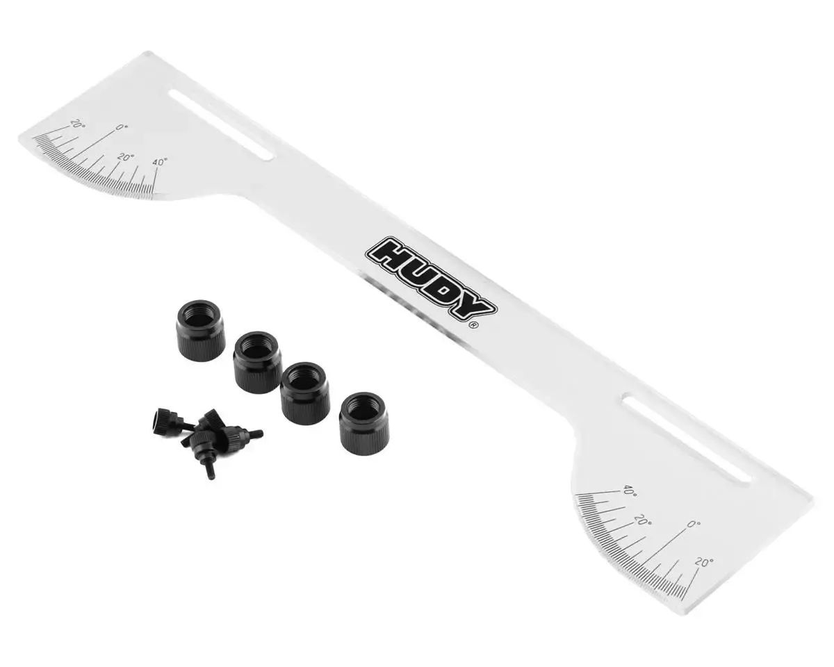 Precision-machined, hard-coated high-grade aluminum components allow very easy and accurate set-up of your 1/8 off-road or GT car. The entire system is very small, light, and well-designed for comfortable and fast transport, and “one screw assembly.” The engraved scales and markings are easy to read, and all parts move very freely due to precision ball-bearings.