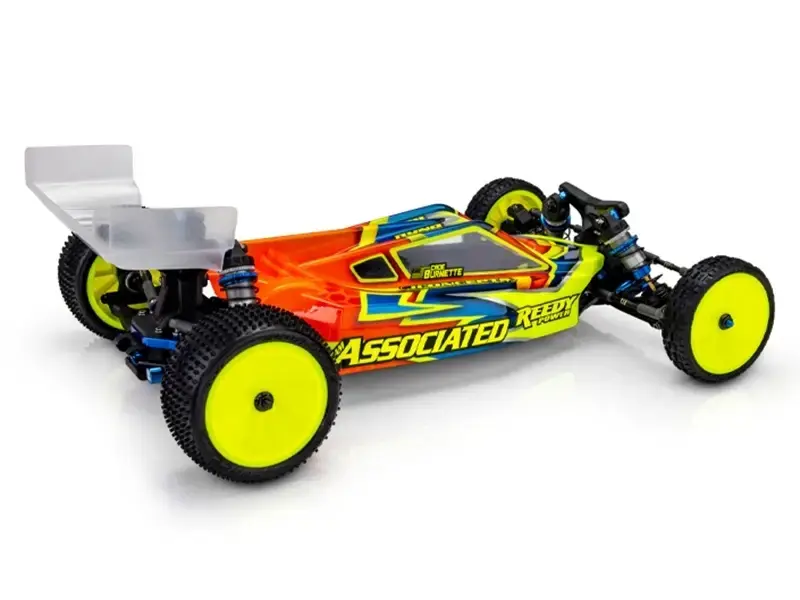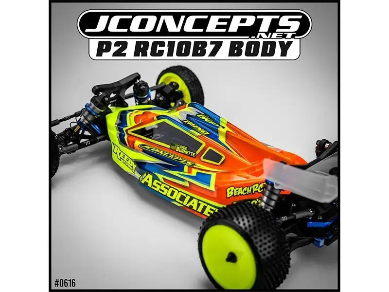 The championship winning item includes two of the 6.5” Carpet | Turf | Dirt wing which is now a standard racing item around the world. The body includes all trim and window lines scribed on the body and masks to quickly cover the inside of the windows for user generated painting technique. The P2 photo car is just an example of what is possible when it comes to custom painting and art performed (not included) around the world. The vivid orange and yellow stunner are painted by Kustom RC Graphics for JConcepts and is a replica of a race scheme developed by Evan Vail.