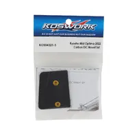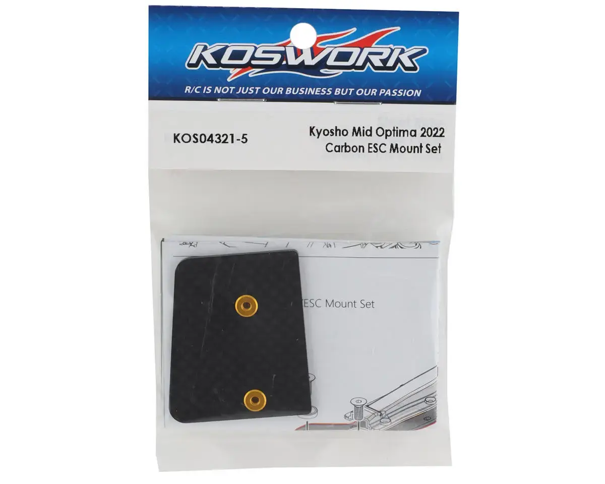 Koswork Kyosho Optima Mid Carbon ESC Mount Set. This optional ESC mount is intended for the Kyosho Optima Mid 2022 chassis. Made from 2mm thick carbon fiber, this mount will allow for extreme durability and strength. Package includes one carbon fiber ESC plate, two shims, and hardware.