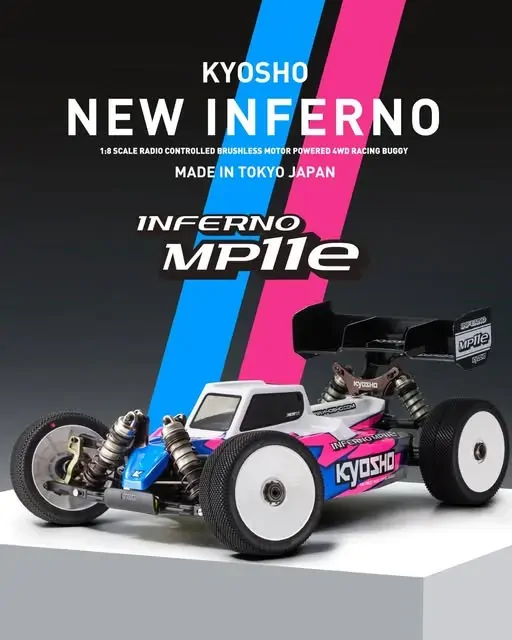 The Kyosho Inferno MP11e is a 1/8 scale 4WD electric off-road racing buggy kit based on the latest Inferno MP11 platform. Designed specifically for electric power, this model incorporates dedicated layout changes to optimise weight balance and performance for modern brushless systems.