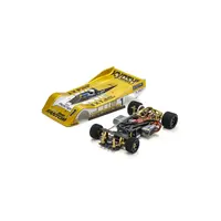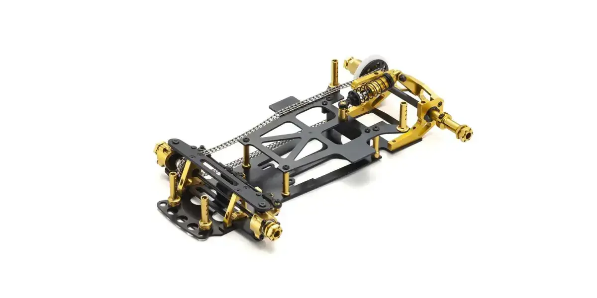 The 60th anniversary gold version of the Ext chassis combines 3-point suspension with the ladder chain 4WD system that revolutionized the R/C racing world in 1985.