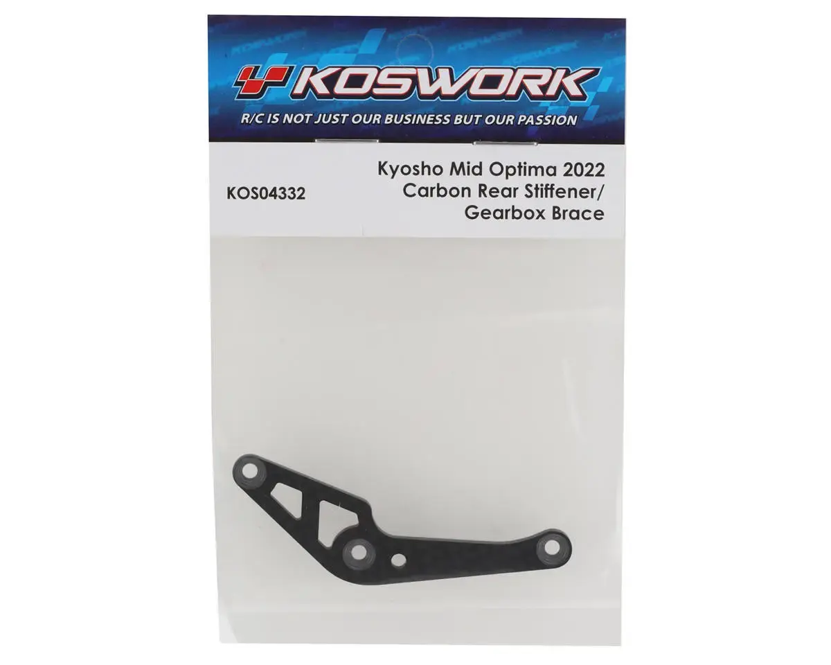 SpecificationsKoswork Kyosho Optima Mid Carbon Rear Gearbox Brace. This optional rear gearbox brace is intended for the Kyosho Optima Mid 2022. Made from 2mm thick carbon fiber, this will allow for a more rigid brace leading to a more consistent chassis setup. Package includes one gearbox brace.