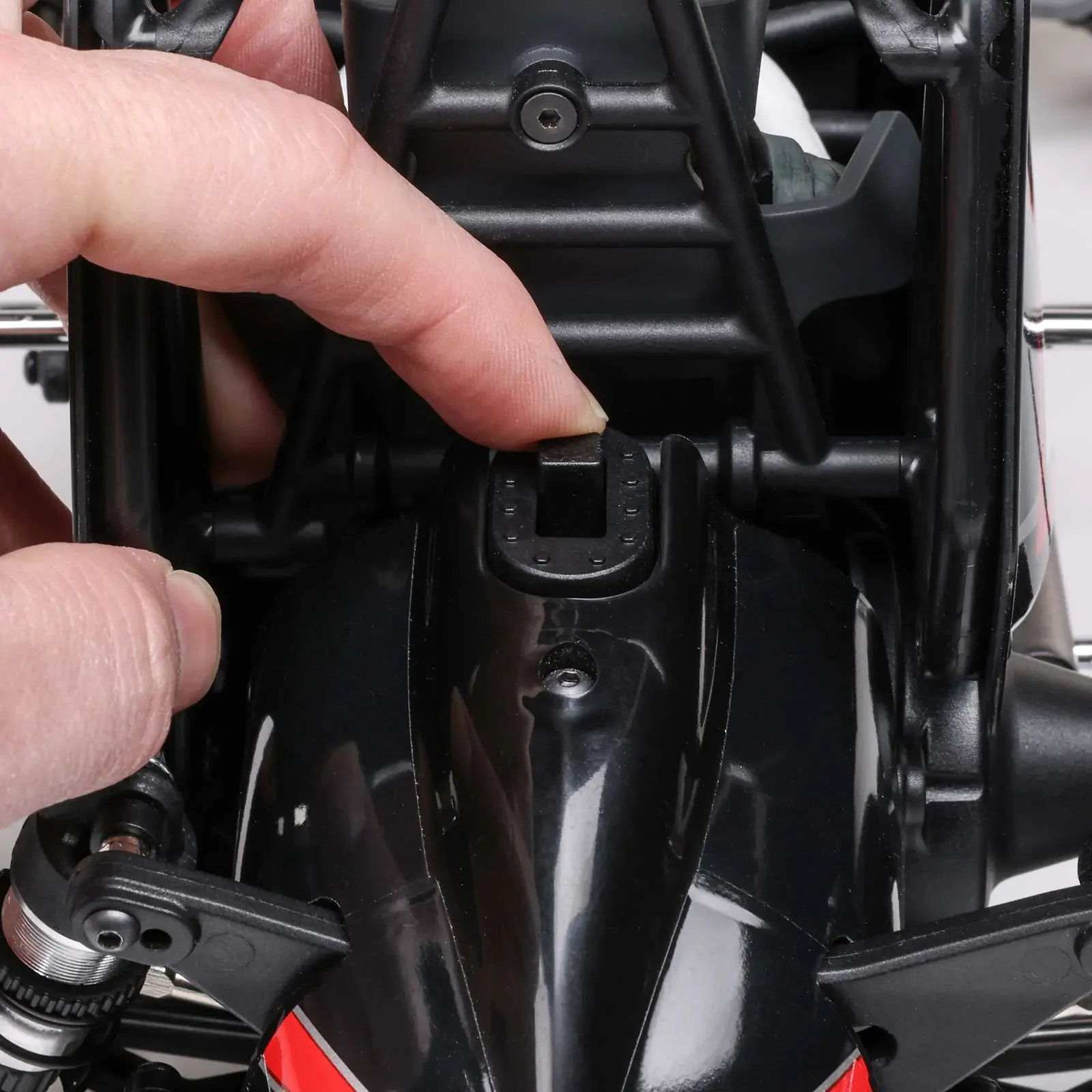 RC vehicles with scale roll cages can be challenging to work on. Sometimes the cage must be disassembled before accessing the chassis for maintenance, repairs, and upgrades. On the Losi 22S Sprint, you just disengage one spring-loaded clip to lift and remove the cage, body, and top wing assembly from the chassis. It’s so easy, it’s almost unbelievable.