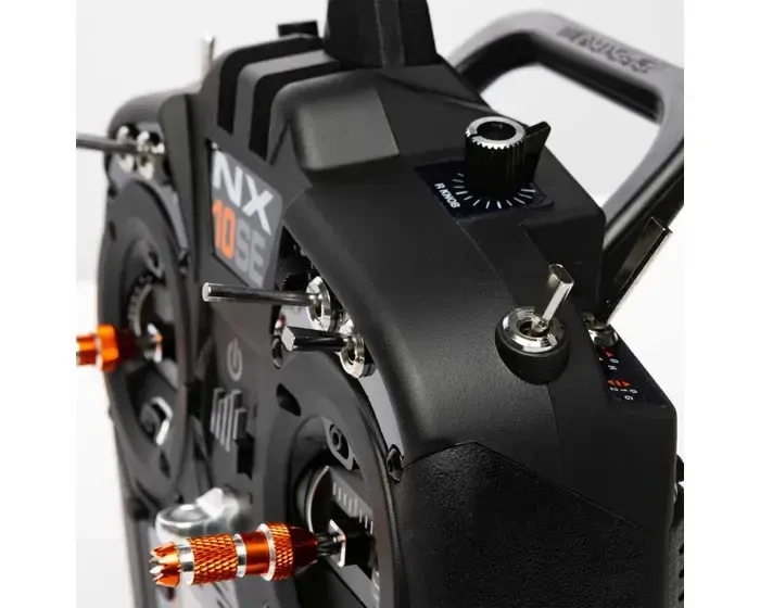 Among its enhanced features are machined aluminum gimbals with magnetic encoders for advanced precision, low maintenance, and exceptionally smooth operation. Short, medium, and long stick ends are provided for customizing the ergonomics to your personal touch. The NX10SE also comes with optional orange switch nuts and an orange grip set, as well as a protective foam case with pockets to store accessories and tools.