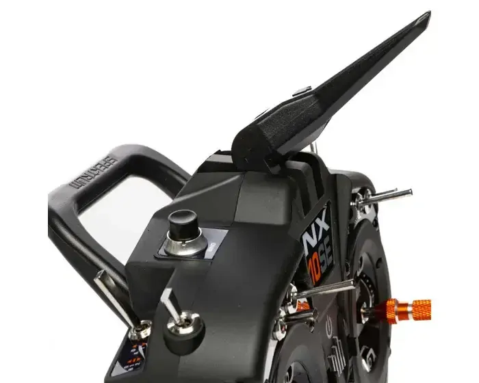 Weight distribution and switch placement have been optimized for comfort and precise, fatigue-free control. Rubber grips make it easy to hold the NX10SE transmitter securely. Its antenna folds conveniently to the front for compact storage and transport. It also helps to prevent accidental powering on by partially blocking the power button.