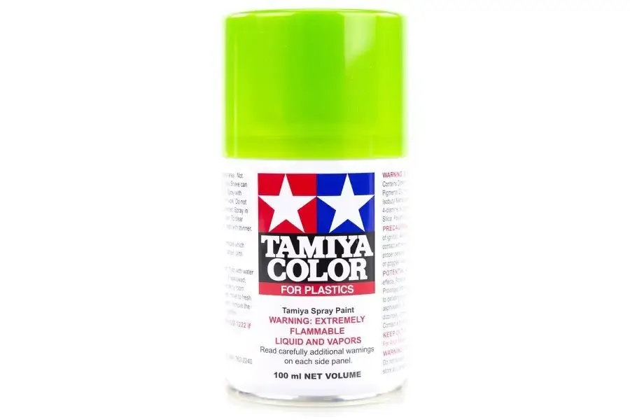 Tamiya TS-52 Candy Lime Green Lacquer Spray Paint 100ml, Tamiya TS spray paint is a synthetic lacquer that cures in a short period of time. Tamiya spray paints are not affected by acrylic or enamel paints & is extremely useful for painting large model surfaces. Therefore, following the painting of the entire assembly, details can be added or picked out using enamel and/or acrylic paints. Each can contains 100ml of paint, which is enough to fully cover 2 or 3, 1/24 scale sized car model bodies.