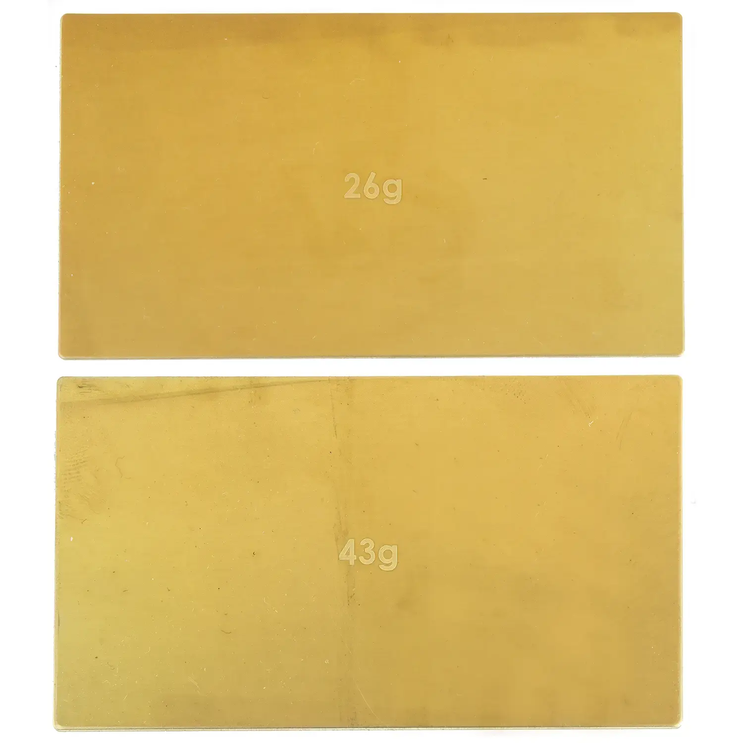 while reducing your vehicle's center of gravity, resulting in improved handling and stability on high-grip surfaces. Each 3.74" x 2.08" brass set contains one each of 26g (.02" thick) and 43g (.04") weights, with their numbers etched into the surface.