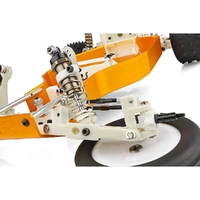 Many of the RC10’s racing refinements can be found up front. A wider, more aggressive stance is made possible with longer front suspension arms. The wider track, combined with zero offset steering blocks give the RC10 more high speed stability and better tracking. Other advantages are quicker steering response and faster turn-in to cut tighter lines through sharp corners. Because no two drivers or tracks are alike, the RC10 front suspension uses front shock towers with additional mounting points for extended travel and progressive spring rate adjustment, quick release spring retainers and turnbuckles to make dialing-in the right settings a simple and rapid process.