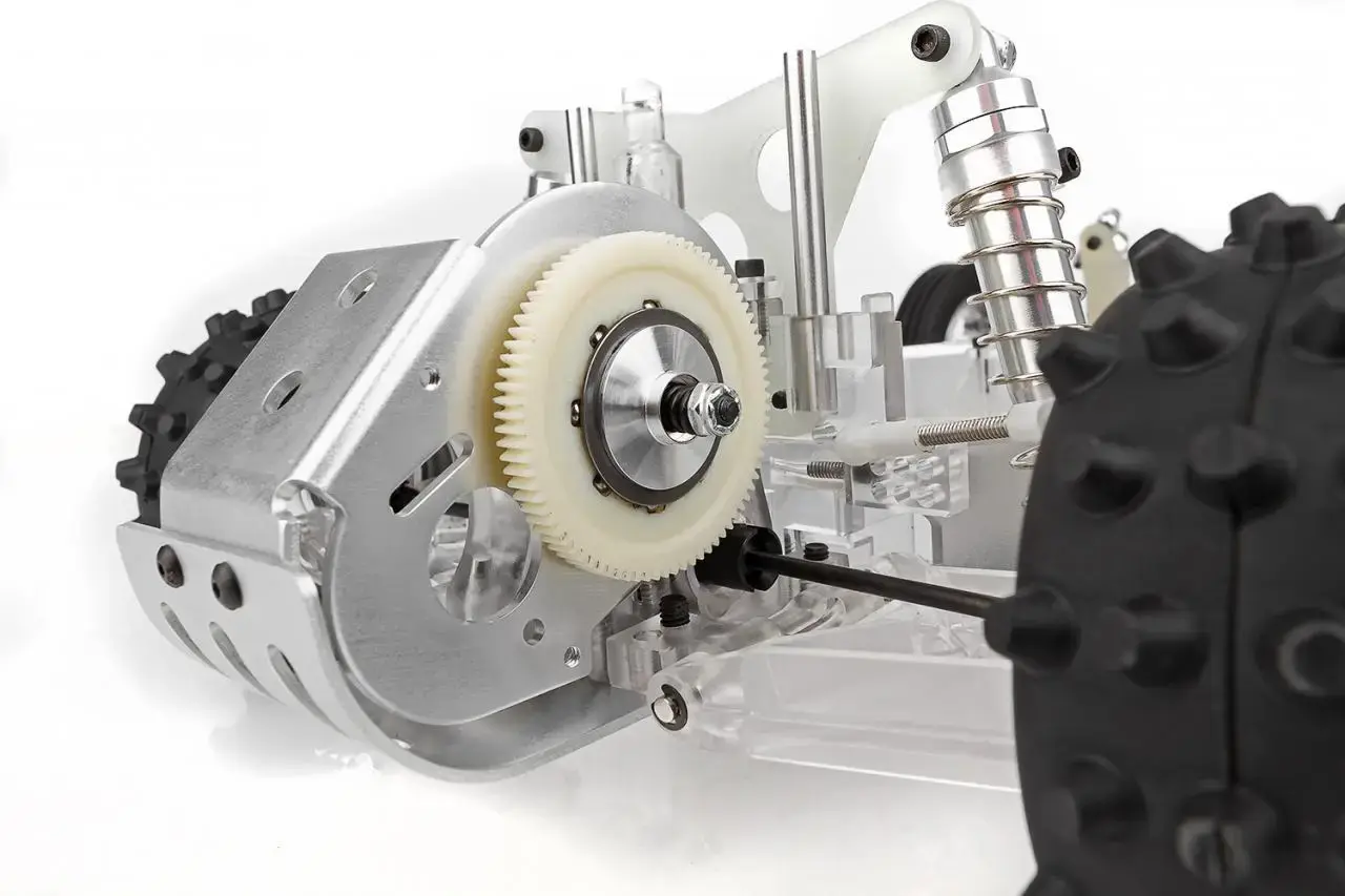 Full race rear suspension includes durable dogbone and stub axle drivetrain with pinned modular wheels. Quick-release knockoff design provides fast, accurate alignment. Low-profile gearbox uses VariLok adjustable diff and is protected by an integrated motor/heatsink.
