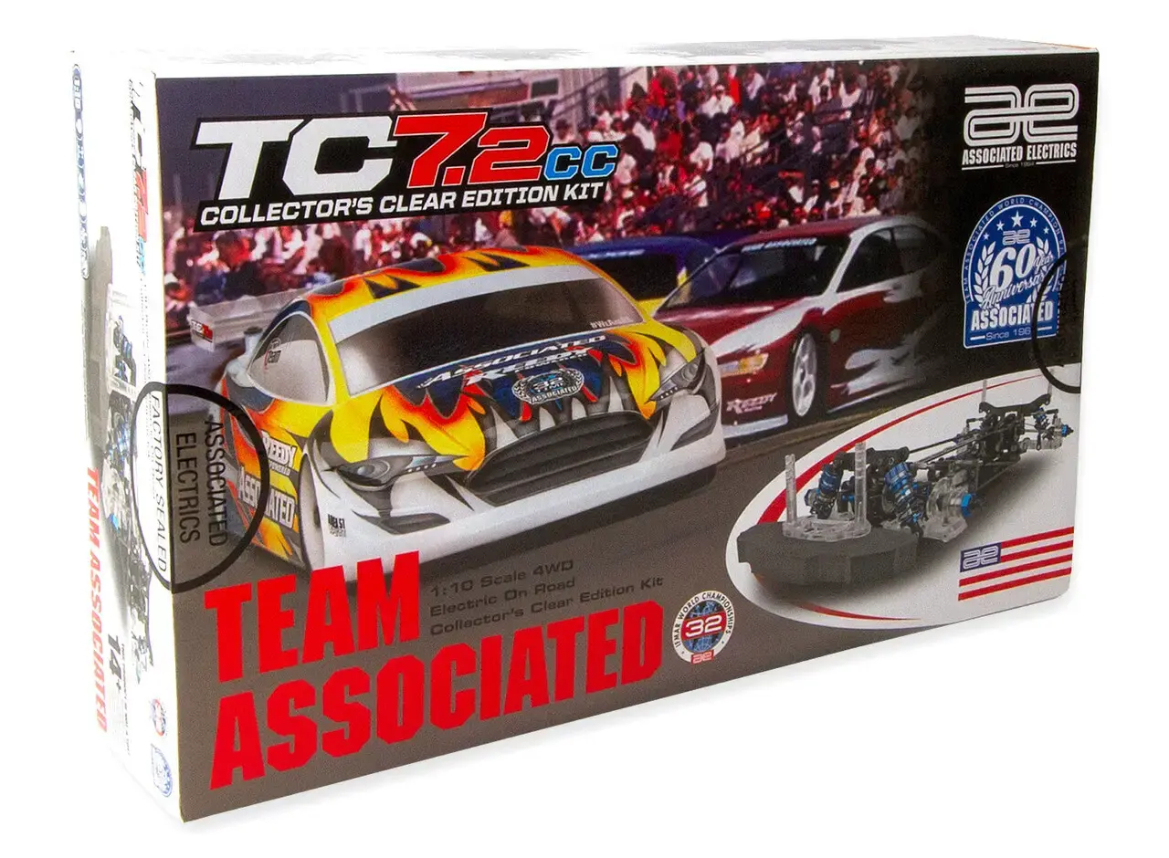 To commemorate one of Team Associated’s most successful 4WD on road touring car platforms, we are proud to announce the TC7.2cc Collector’s Clear Edition Kit. This kit offers RC collector’s* the ability to build the successful 1:10 scale touring car platform in iconic polycarbonate clear material.