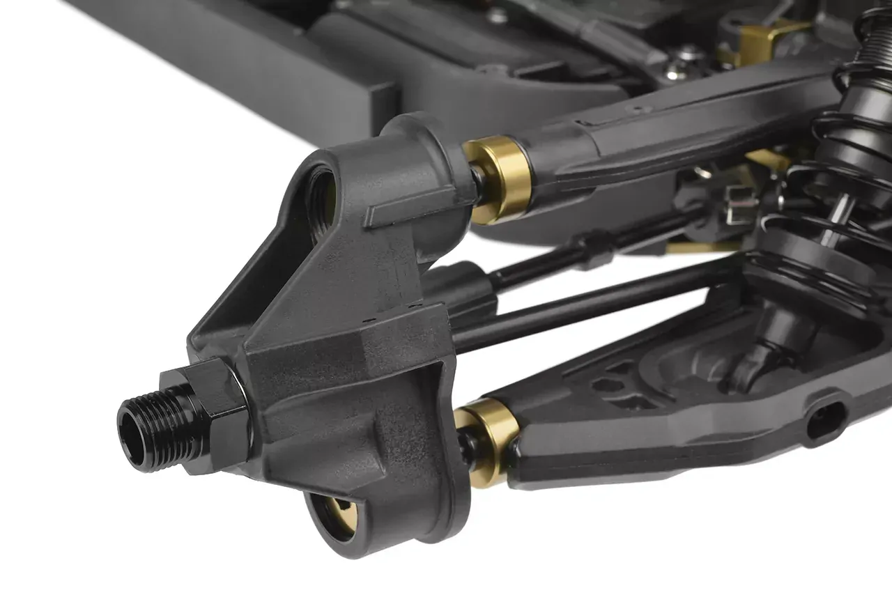 At the heart of the Kagama Limited Edition is its uncompromising 7075 aluminum backbone - a foundation engineered for extreme durability and precision handling. The gold-anodized 7075 aluminum chassis not only provides unmatched strength but also delivers an exceptional style. To further reinforce the structure, CNC-machined 7075 aluminum bulkheads lock the drivetrain in place, preventing unwanted movement and ensuring smooth, reliable power delivery, even under extreme loads. Meanwhile, the 6mm 7075 aluminum shock towers, paired with the new shock standoffs, provide rock-solid suspension support, allowing the proven Kagama shocks to absorb impacts consistently - no matter how hard you push the truck. Additionally, the 7075 Aluminum Servo Saver Bell Crank enhances steering precision and durability, ensuring direct and responsive handling in any driving condition.