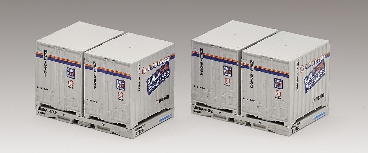 SpecificationsThe NEL container is a 6-foot container originally made by Nippon Express that opens on both the front and sides. When loaded onto a container freight car, two containers are placed on top of a UM9A frame. It is used between 32 bases nationwide and Korea.