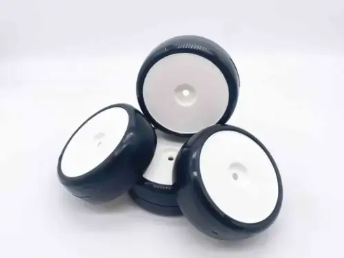 We are pleased to announce that we have developed a 1/10 touring car tire with a well-known Asian manufacturer. This tire is glued to white closed wheels with high-quality inlays.