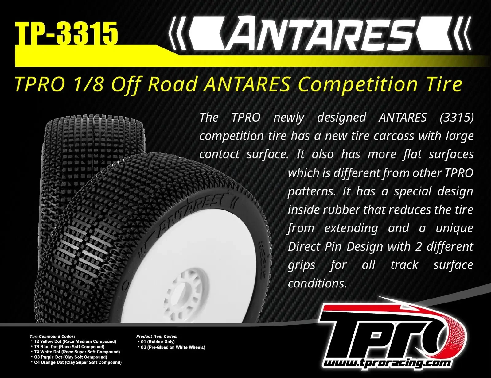 Unleash the power of precision with the TPRO ANTARES competition tire, engineered to give you the edge on any track. Featuring a newly designed tire carcass with a large contact surface, this tire ensures exceptional grip. The flat surface pattern sets it apart from other TPRO designs, offering enhanced performance.