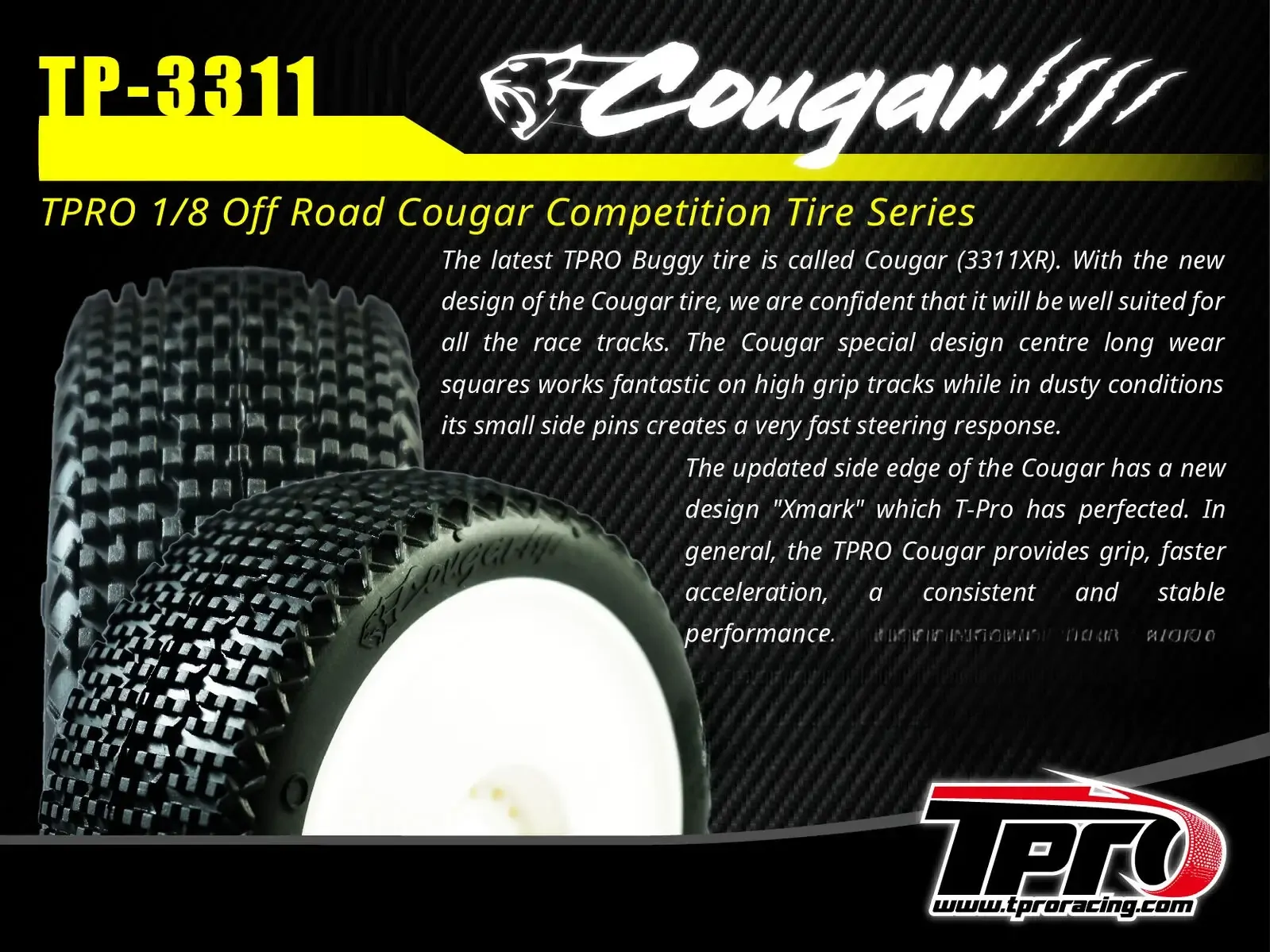 The updated "Xmark" side edge design ensures faster steering response and better overall performance, making the Cougar the ideal tire for racers who demand grip, acceleration, and stability in every condition. Whether you're racing on a high-traction surface or tackling tricky, dusty tracks, the TPRO Cougar provides the consistent, stable performance you need to stay ahead of the pack.
