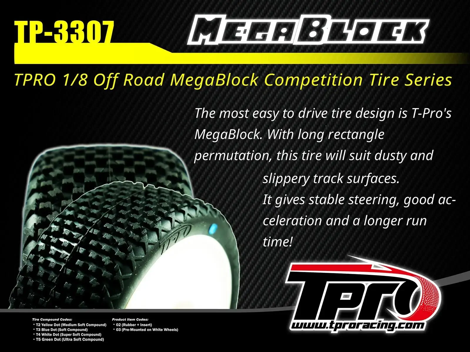 The TPRO MegaBlock tire is designed to be the easiest to drive in dusty and slippery track conditions. Featuring a unique long rectangle pattern, the MegaBlock provides exceptional traction on challenging surfaces, making it a perfect choice for tracks that are tough to navigate.