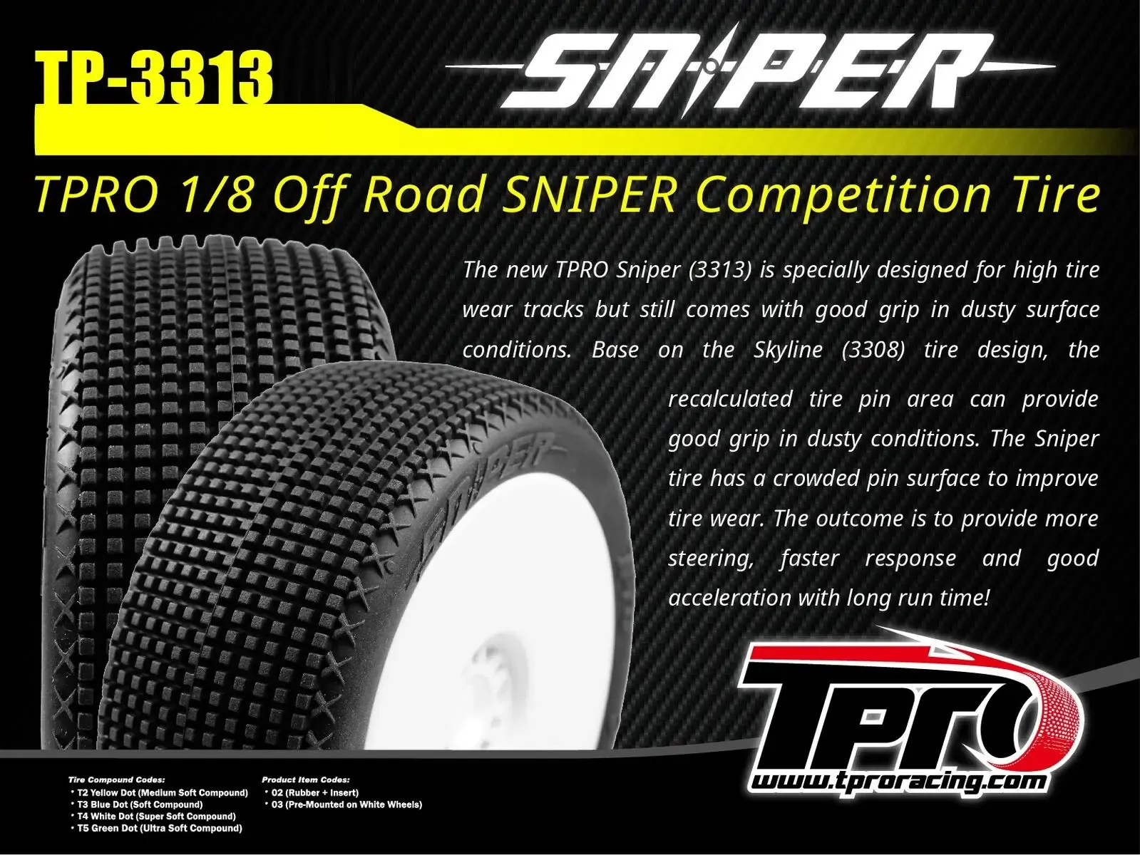 The TPRO Sniper tire (3313) is engineered for high-tire wear tracks, while still delivering excellent grip on dusty surfaces. Building off the successful Skyline (3308) tire design, the Sniper features recalculated tire pin areas that enhance grip, especially in dusty conditions. The crowded pin surface optimizes tire wear, improving the longevity and consistency of your performance.
