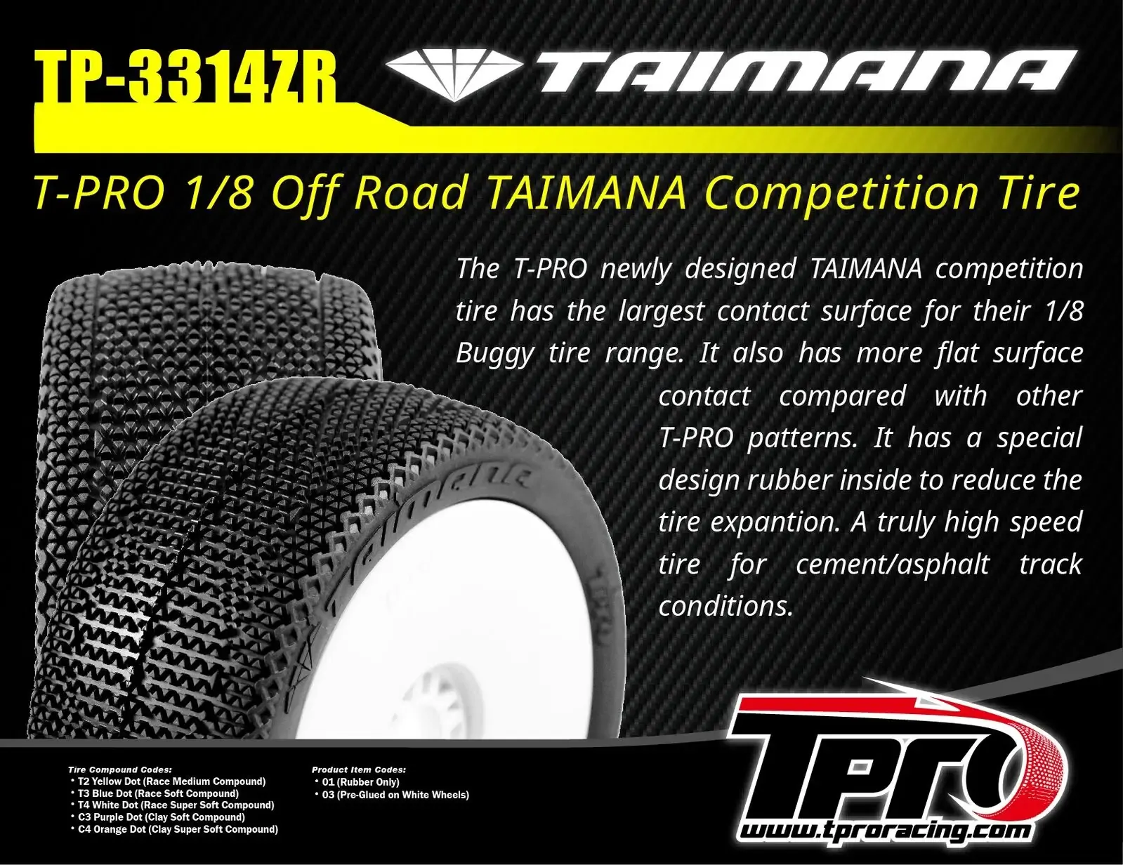 Introducing the TPRO TAIMANA 1/8 Off-Road competition tire, designed for ultimate high-speed performance on cement and asphalt track surfaces. With the largest contact surface in the TPRO 1/8 buggy tire range, the TAIMANA offers superior grip and stability, giving you an edge in the most demanding racing conditions.