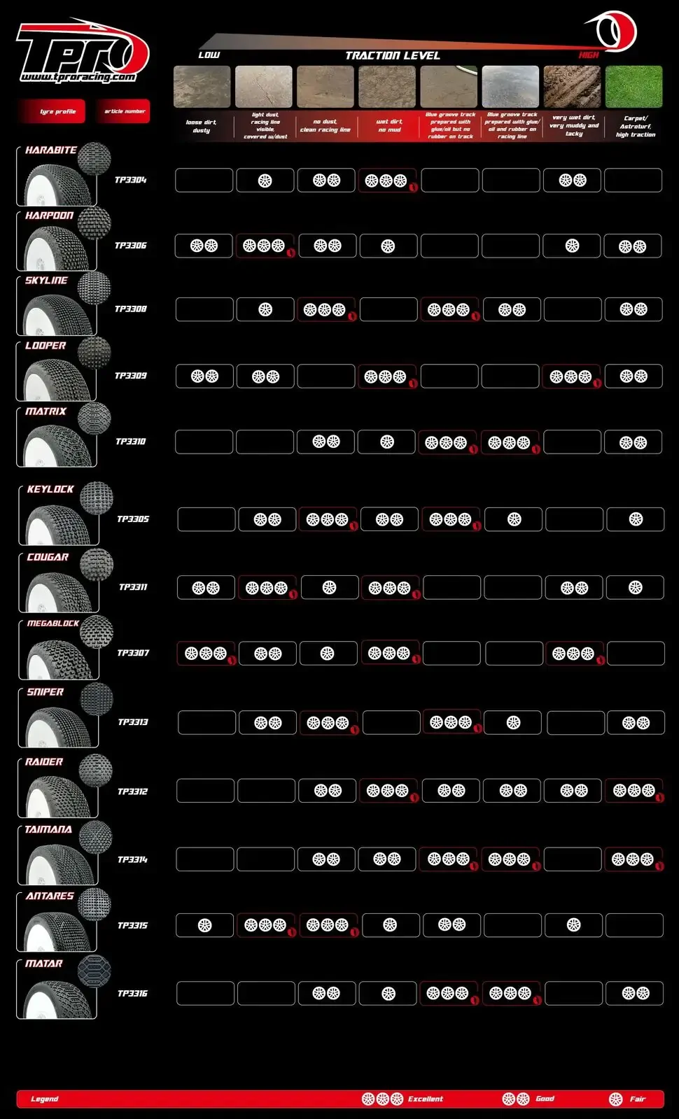 - Ideal for cement and asphalt track conditions.