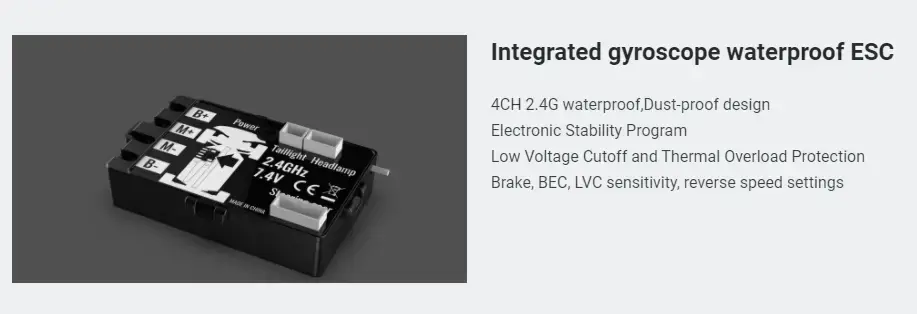 1/16th Fully proportional high-performance 4WD racing car, integrated Electronic Stability Program (Gyro) , effectively correct yaw, easier to control. Two new striking colour schemes to choose between. 4CH 2.4GHz integrated receiver and electronic speed control (ESC) Waterproof, dustproof design ESP (Electronic Stability Program) Low voltage cut-off and thermal overload protection, brake, BEC, LVC sensitivity, reverse speed, and motor timing settings.